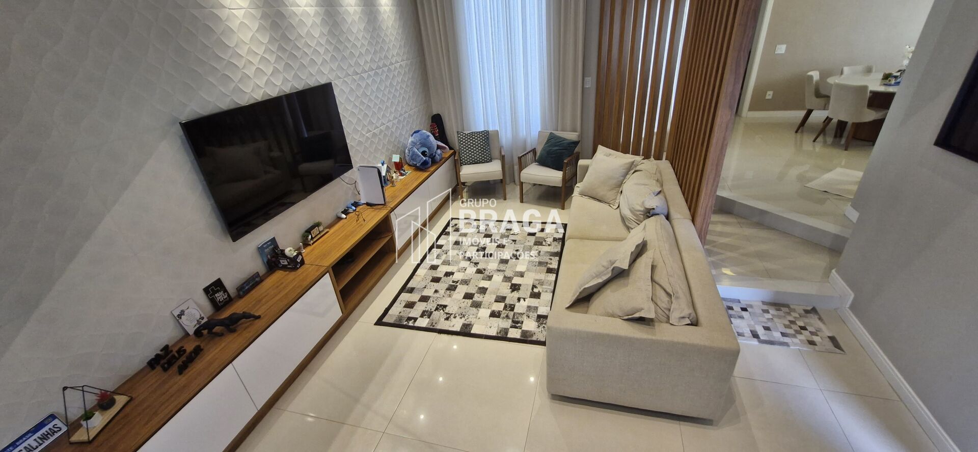 A área social é composta por uma sala de estar integrada, perfeita para momentos de convivência, conectada a uma cozinha planejada que une praticidade e bom gosto. São três dormitórios, incluindo uma suíte, além de banheiros com revestimentos de qualidade, garantindo conforto e sofisticação.