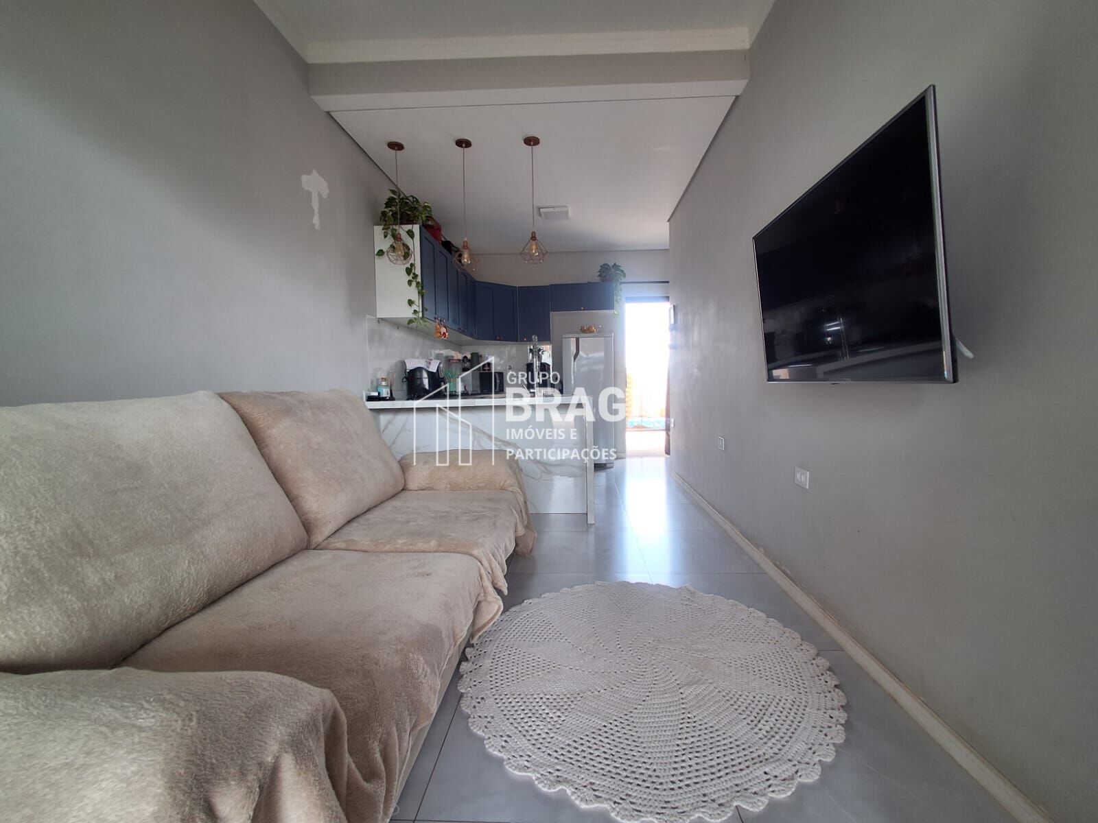 Na parte interna, o imóvel dispõe de ambientes integrados e bem iluminados. A cozinha apresenta um excelente padrão de acabamento, com móveis planejados, bancada em pedra, cooktop e armários em ótimo estado, oferecendo praticidade e organização no dia a dia. O espaço se integra à sala de estar, criando um ambiente moderno e funcional.